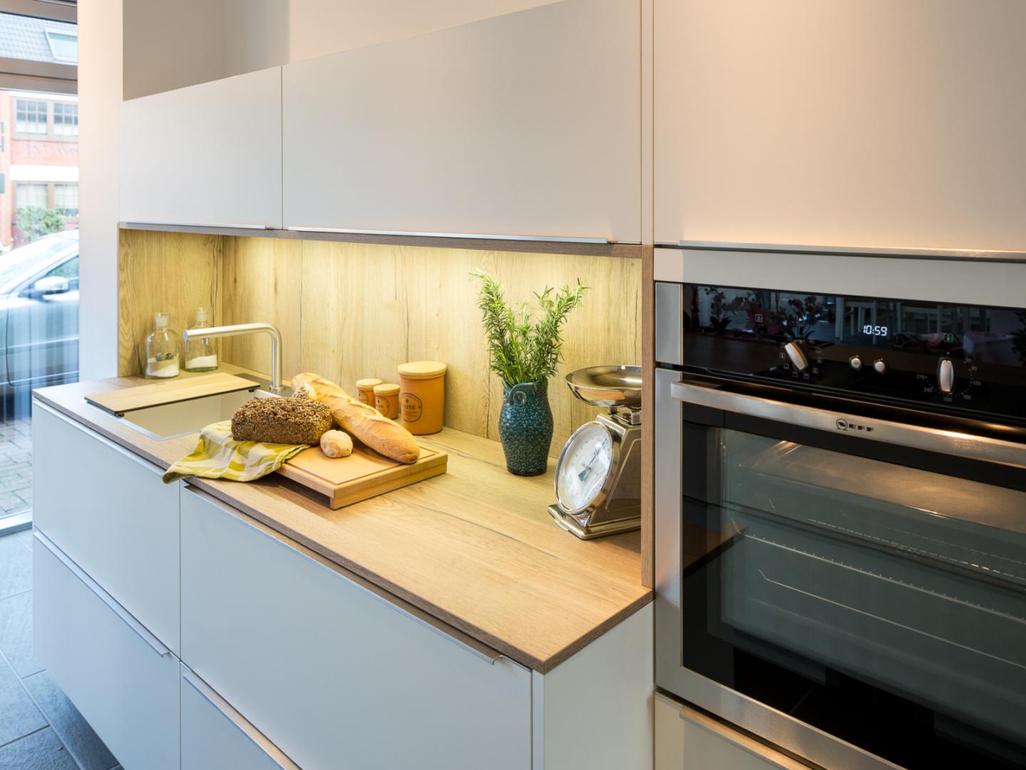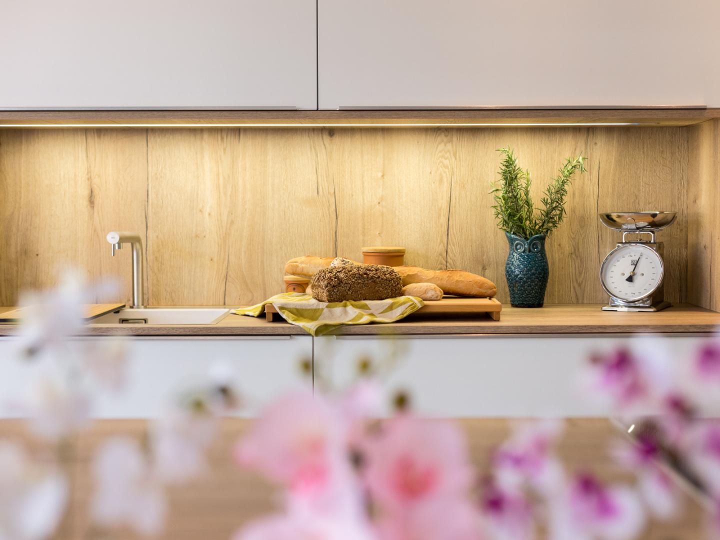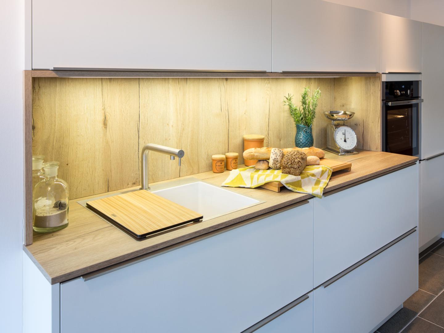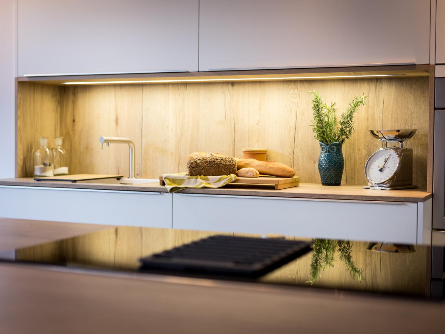Beim Spülbecken und der filigranen Armatur setzt sich die klare Linienführung fort. Die große Kochinsel bietet auch rückseitig viel Stauraum, das Brüstungsregal setzt hier einen Akzent. Das breite Induktionskochfeld kann auf Wunsch auch gegen eine Muldenlüftung ausgetauscht werden. Ein 3-fach-Abfallsammler, Besteckkästen, Beleuchtung und Antirutschmatten gehören zur Ausstattung. Weiter sind die angegebenen Elektrogeräte enthalten, die jedoch nach Ihren Wünschen angepasst werden können (Aufpreis möglich).