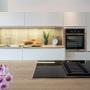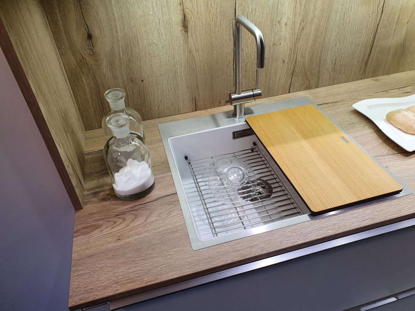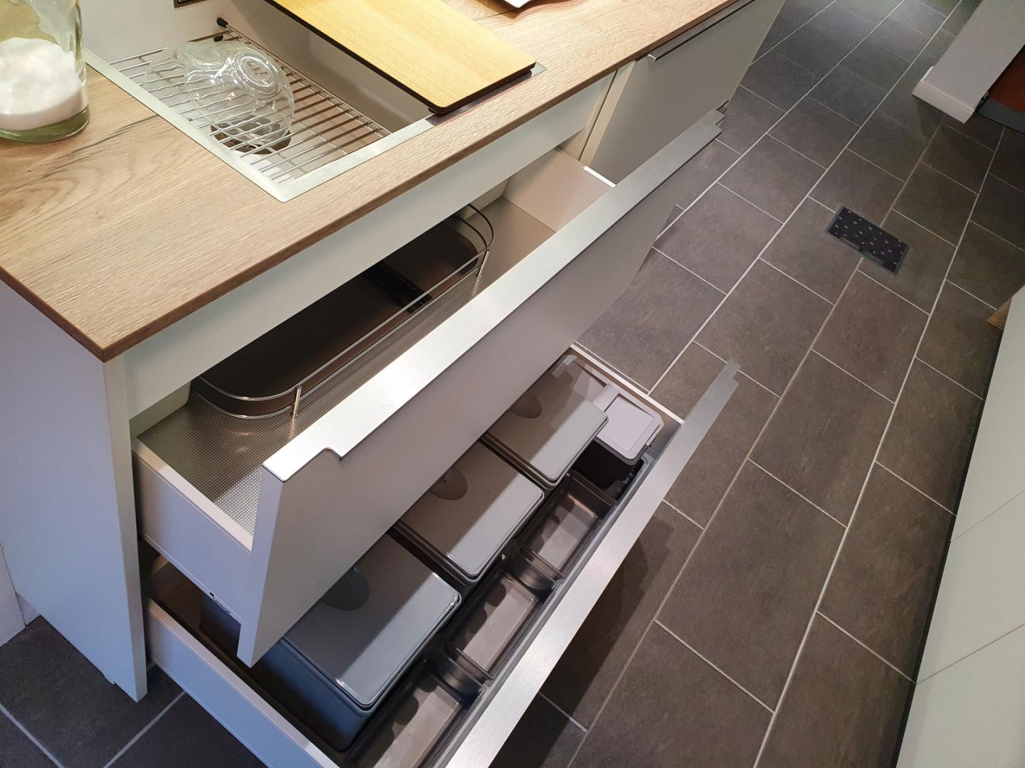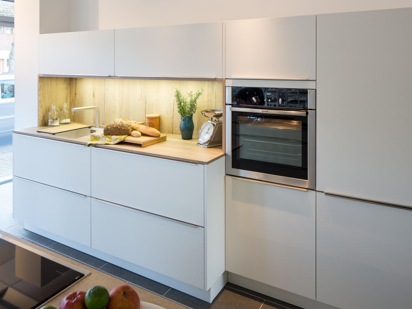 Beim Spülbecken und der filigranen Armatur setzt sich die klare Linienführung fort. Die große Kochinsel bietet auch rückseitig viel Stauraum, das Brüstungsregal setzt hier einen Akzent. Das breite Induktionskochfeld kann auf Wunsch auch gegen eine Muldenlüftung ausgetauscht werden. Ein 3-fach-Abfallsammler, Besteckkästen, Beleuchtung und Antirutschmatten gehören zur Ausstattung. Weiter sind die angegebenen Elektrogeräte enthalten, die jedoch nach Ihren Wünschen angepasst werden können (Aufpreis möglich).