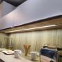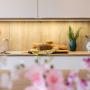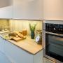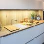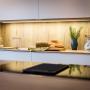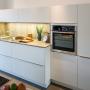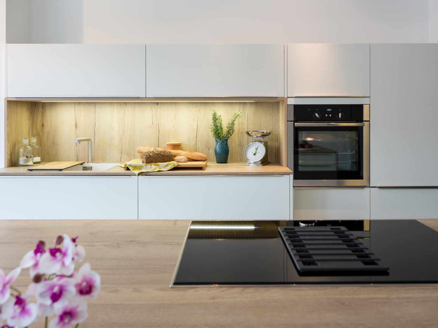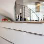 Moderne weiße Küche mit aufgesetzter Griffleiste und dünnen Arbeitsplatten